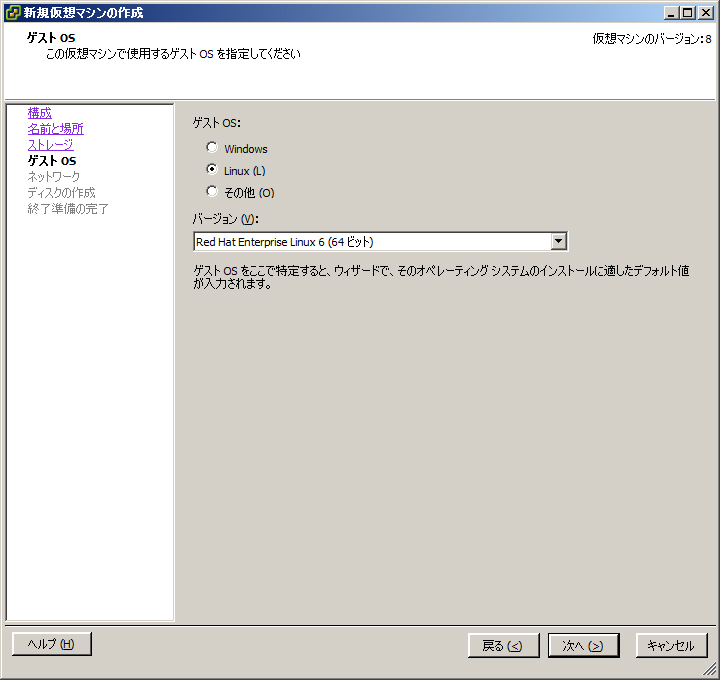 1. [ バージョン ] で [ Red Hat Enterprise Linux 6(64ビット) ] を選択